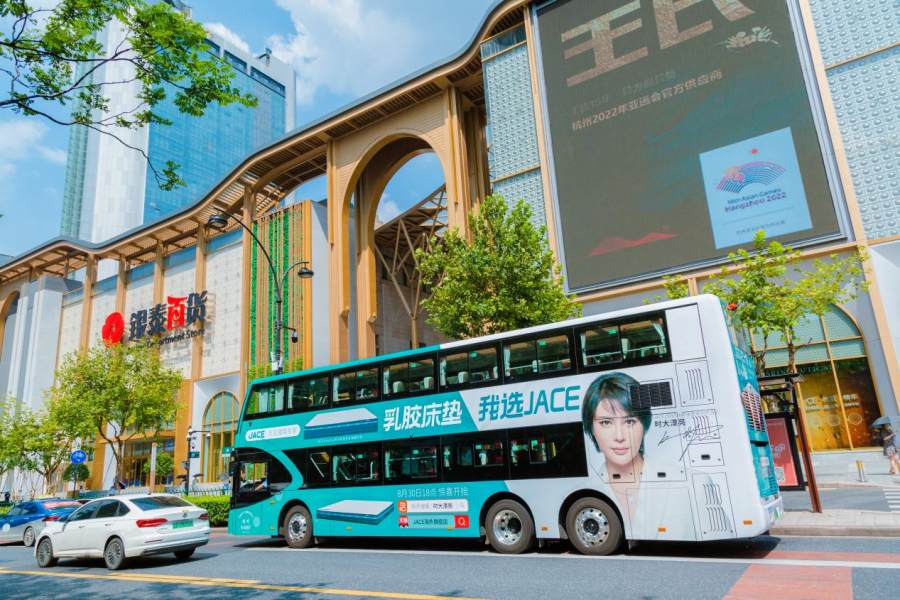庞大可观的数据背后,折射出了JACE作为乳胶寝具行业中的佼佼者在新主流消费群体中也拥有着不容小觑的受众潜力,这为JACE加速入局快手平台提供了动力。而时大漂亮作为快手平台最具影响力的主播之一,两者的联合可以说是顺理成章的事情。 02 线上线下全方位营销,组合拳精准出击 8月28日起,时大漂亮的代言物料就在全国一二线城市陆续铺设,覆盖广州、杭州等地的重要公交站点候车亭、线路公交车身以及楼宇电梯厅,精准辐射城市主流消费人群。其中杭州520线路双层巴士途经京杭大运河、西湖等自然风景名胜以及武林广场、杭州大厦、延安路等大流量商业综合体。